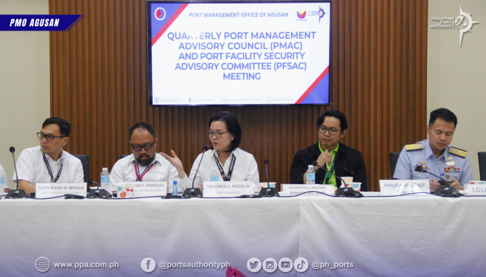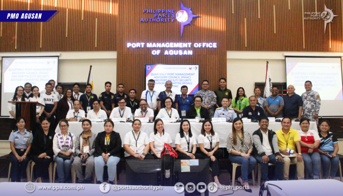 The Port Management Office (PMO) of Agusan held its Fourth Quarter Joint Port Management Advisory Council (PMAC) and Port Facility Security Advisory Committee (PFSAC) meeting for CY 2024 on November 26, 3024 at the PMO Multipurpose Hall, Port of Nasipit. Key stakeholders in attendance included representatives from shipping lines, maritime and law enforcement agencies, Local Government Units (LGUs), harbor pilots, and terminal operators Globalport Agusan Terminal Inc. (GATI) and Concord Arrastre & Stevedoring Corp. (CASCOR), alongside senior officers of the PMO.