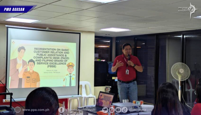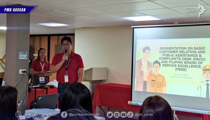 In its continuing efforts to deliver efficient and client-centered public service, the Philippine Ports Authority (PPA), Port Management Office (PMO) of Agusan, conducted a Reorientation on Basic Customer Relations, Public Assistance and Complaints Desk (PACD), and the Filipino Brand of Service Excellence (FBSE) on February 24, 2026, at the Activity Center of TMO Butuan. The activity aimed to reinforce service standards and enhance the capability of TMO Butuan personnel in addressing public concerns within the port environment.