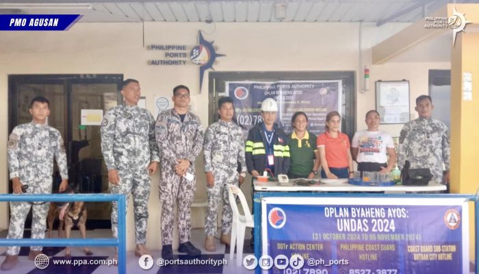 Sa paggunita ng Undas 2024, nagpamalas ng kahandaan ang PPA PMO Agusan, sa pamamagitan ng Port Services at Port Police Division, kasama ang mga nasasakupang pantalan ng Nasipit, Masao, at Butuan, para sa Oplan Biyaheng Ayos: Undas 2024 na naglalayong tiyakin ang maayos at ligtas na paglalakbay ng mga pasahero.
